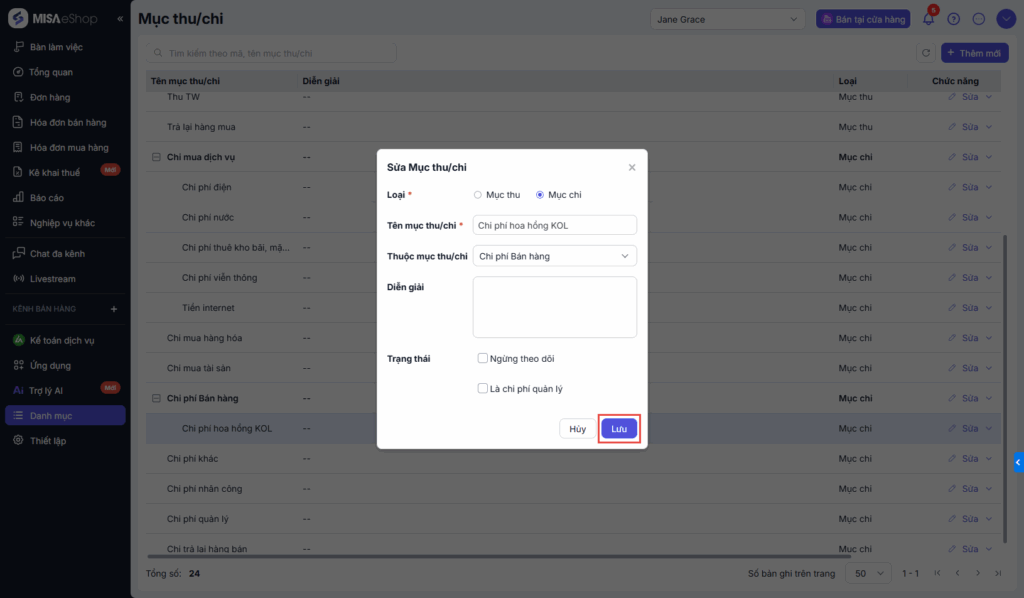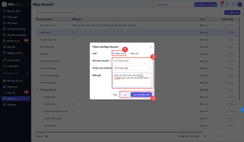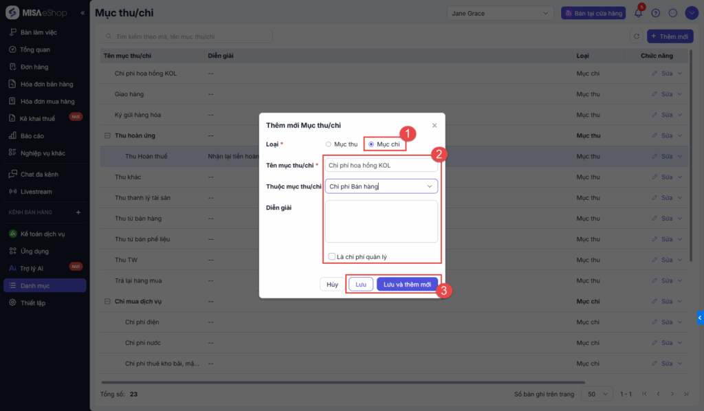Bước 3: Thiết lập thông tin Mục thu/chi