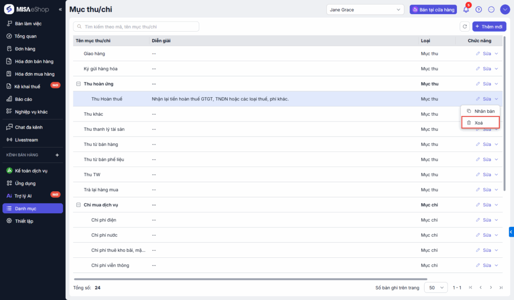 Lưu ý: Với các mục thu chi là mục thu/chi của hệ thống sẽ không thể Xóa để không ảnh hưởng tới báo cáo Quỹ tiền.