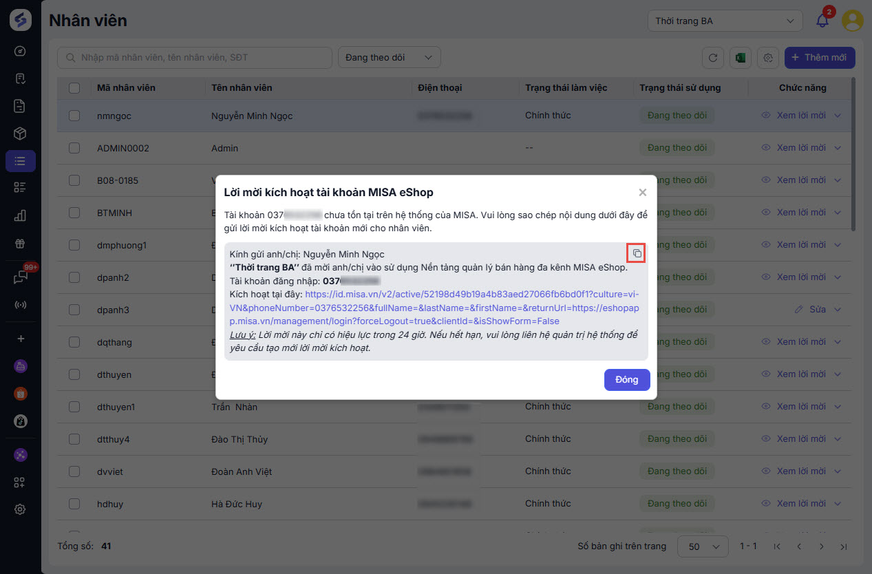 - Nhấn Sao chép để gửi đường dẫn kích hoạt cho nhân viên.