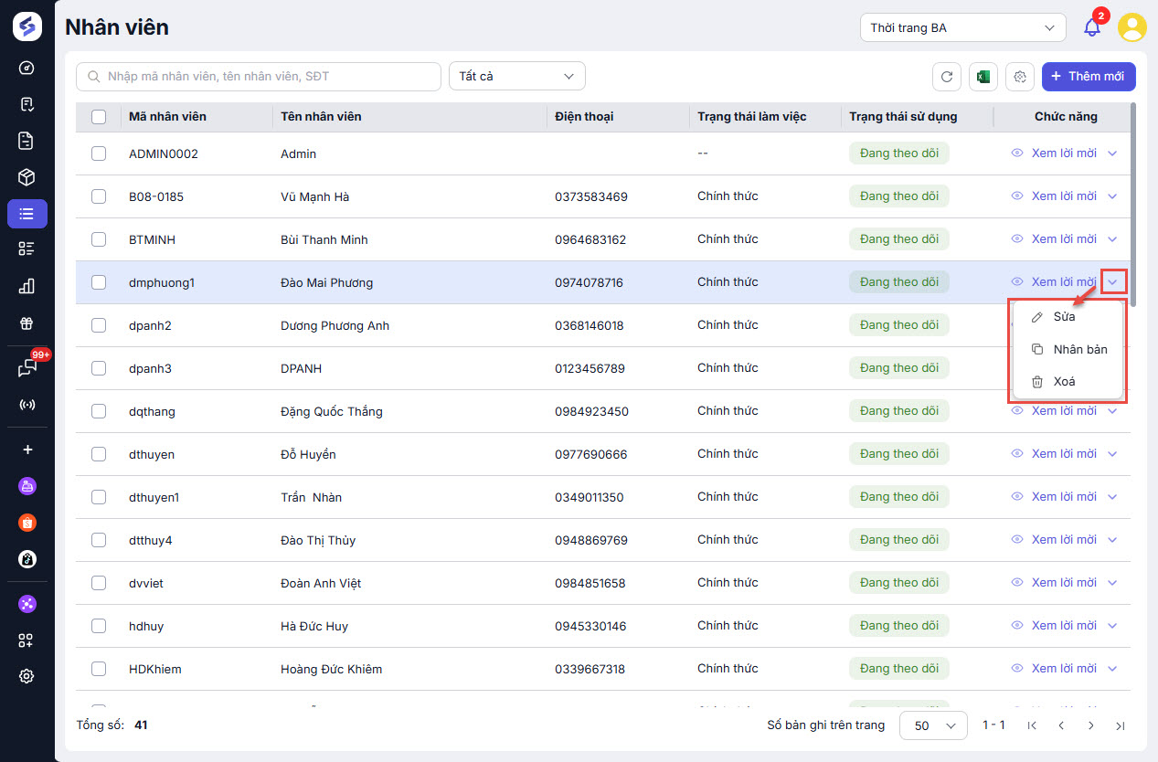 – Sửa: Chọn “Sửa” để chỉnh sửa thông tin nhân viên.