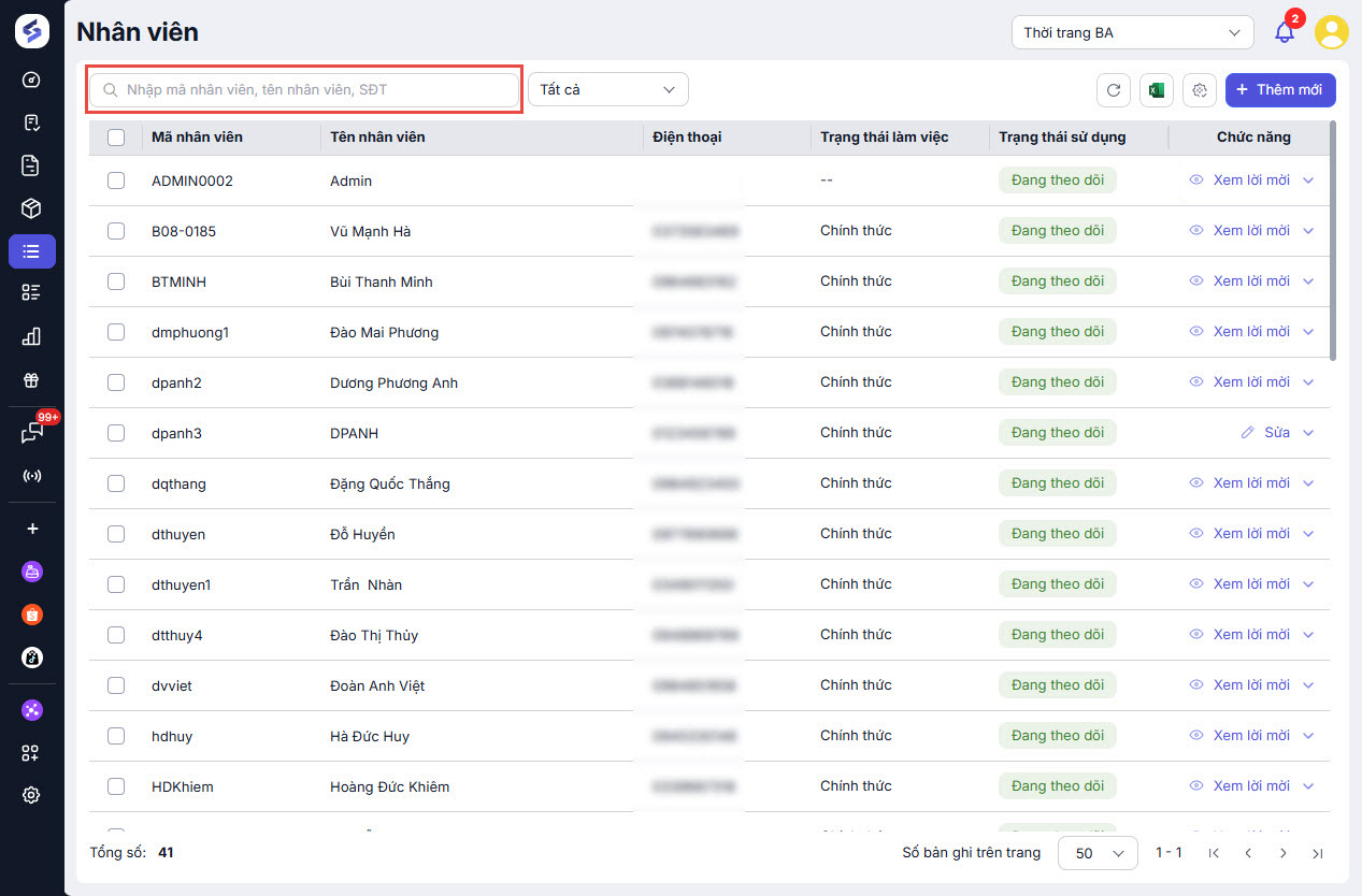 Sử dụng thanh tìm kiếm phía trên để tra cứu theo mã nhân viên, tên nhân viên hoặc số điện thoại.