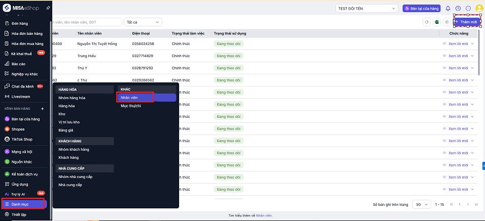 Tại menu bên trái, chọn Danh mục → mục Khác → chọn Nhân viên.