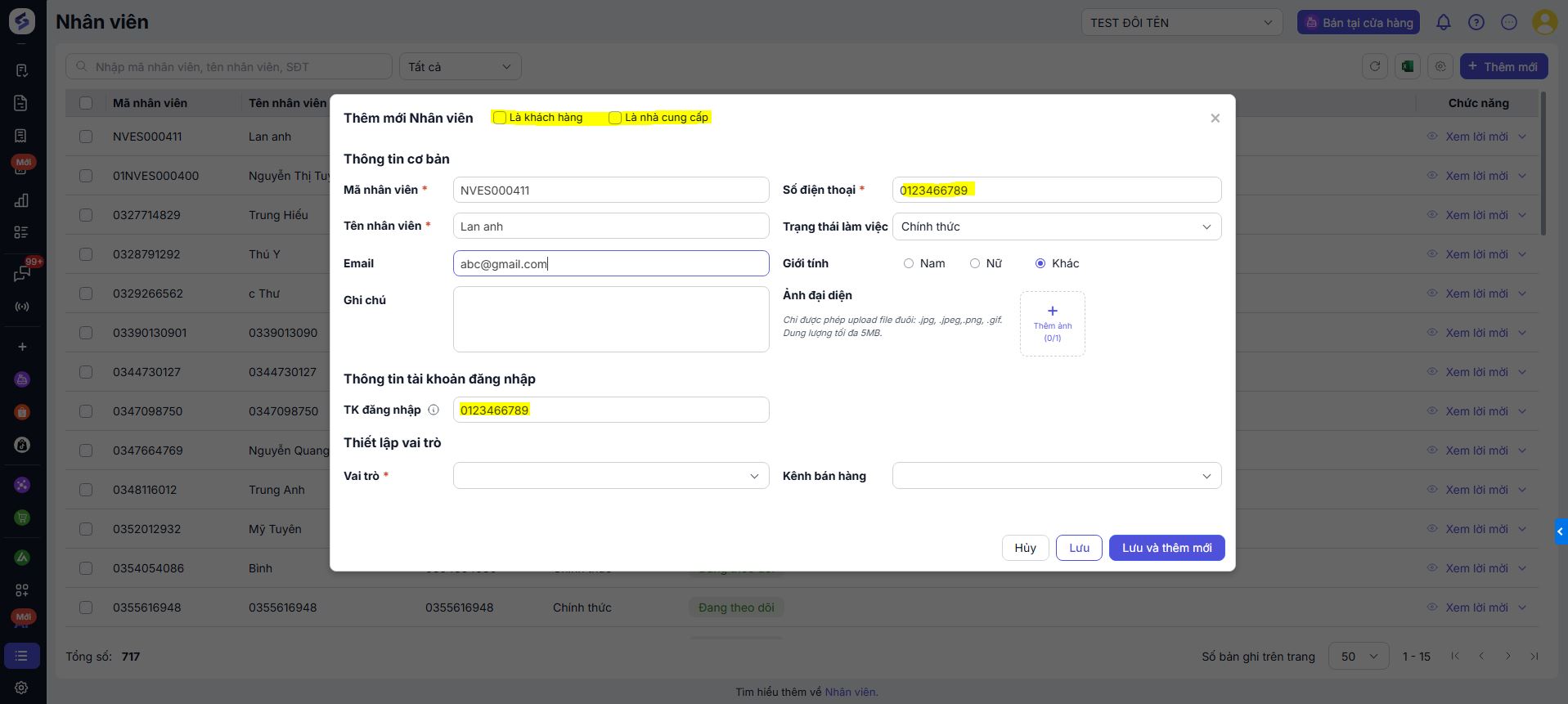 Nhập đầy đủ thông tin trong biểu mẫu: Mã nhân viên, Tên nhân viên, Email, Số điện thoại, Trạng thái làm việc, Giới tính, Ảnh đại diện, Thông tin tài khoản đăng nhập (phần mềm sẽ gợi ý theo số điện thoại), Vai trò (chọn kênh bán hàng, chọn vai trò cho từng kênh bán).