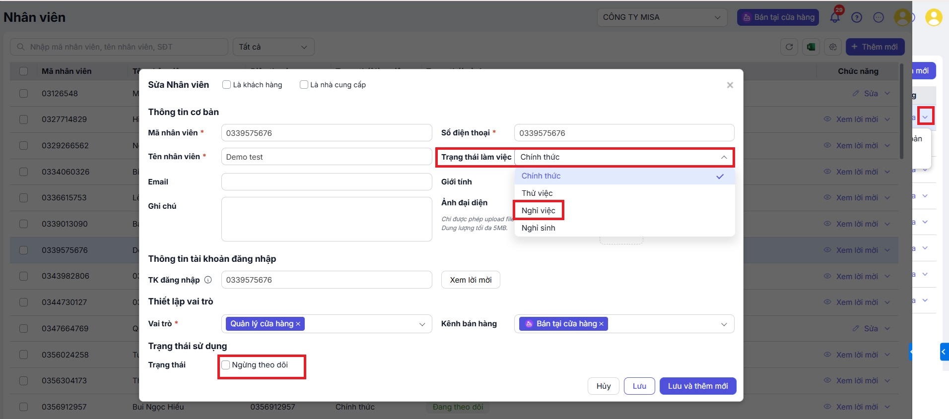 Nhấn Lưu để hoàn tất hoặc Lưu và thêm mới nếu muốn tiếp tục tạo thêm nhân viên khác.