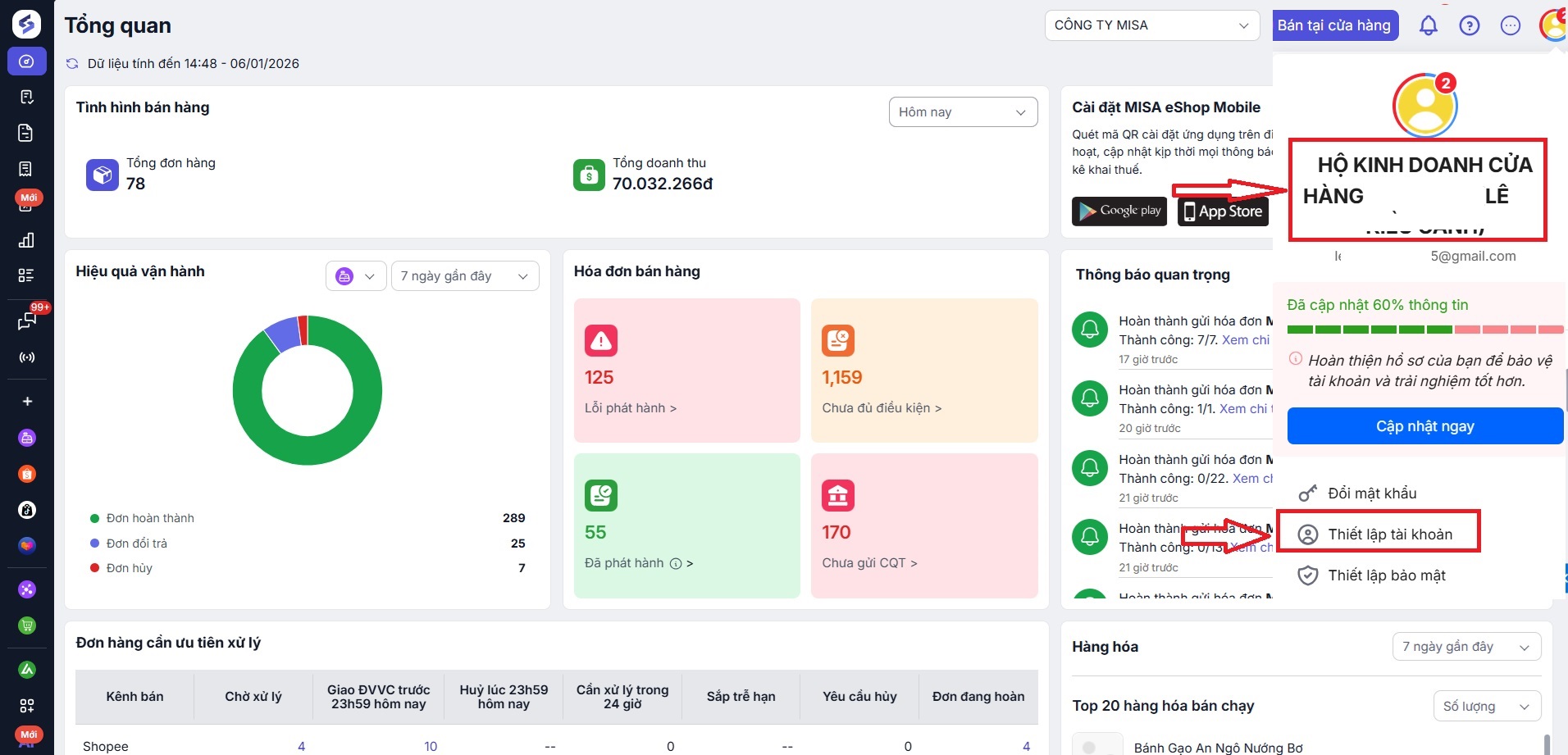 Trường hợp Đơn vị đã thay đổi tên cửa hàng trong Thiết lập. Nhưng tích Biểu tượng người dùng (ở góc trên bên phải) phần mềm vẫn hiển thị thông tin tên cửa hàng cũ. Đơn vị thực hiện thay đổi thông tin người dùng như sau: