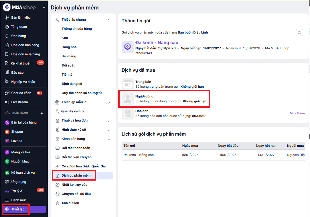 Lưu ý: Để xem số lượng người dùng trong gói (số lượng nhân viên có thể thêm vào để sử dụng MISA eShop) tại menu bên trái, chọn Thiết lập -> Dịch vụ phần mềm -> Dịch vụ đã mua -> Người dùng để xem số lượng người dùng trong gói.