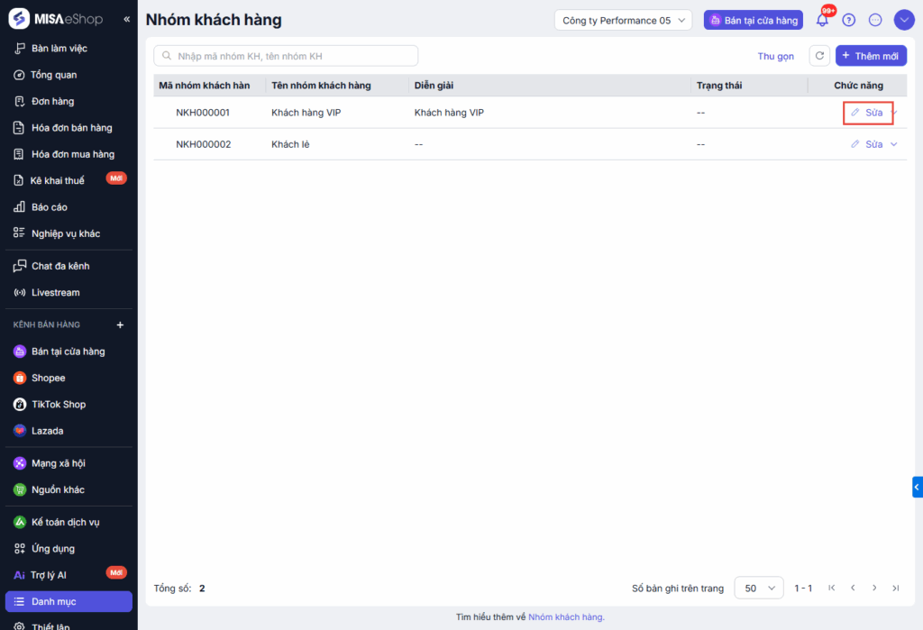 Tại danh sách nhóm khách hàng, chọn chức năng Sửa tại Nhóm khách hàng cần sửa và thực hiện sửa tương tự thêm mới.