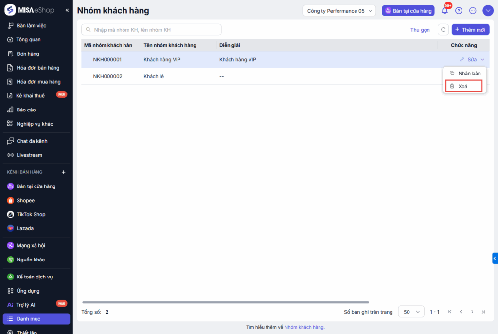 Tại danh sách nhóm khách hàng, chọn chức năng Xóa tại Nhóm khách hàng cần xóa.
