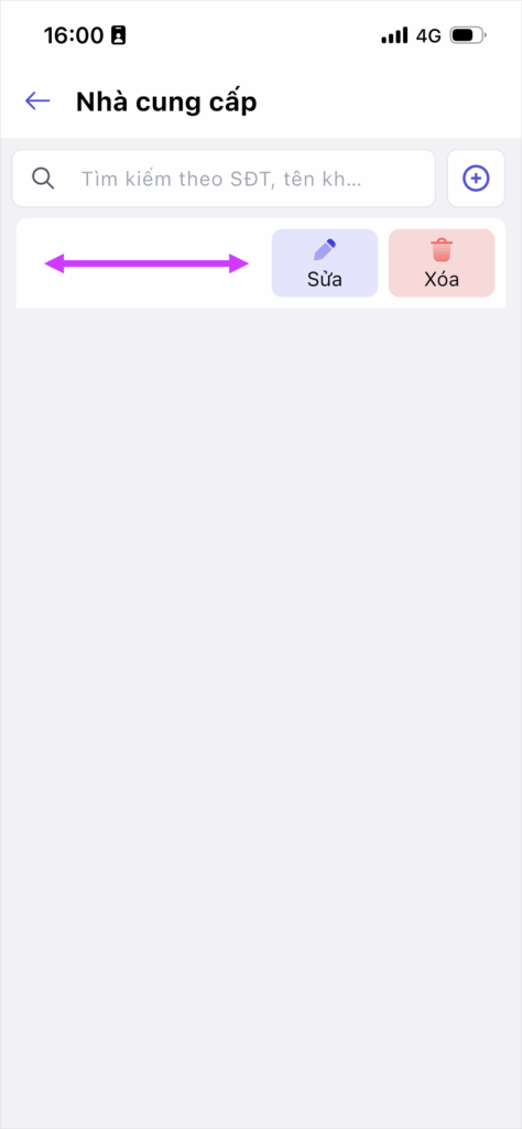 Trên danh sách nhà cung cấp, tại nhà cung cấp cần sửa thông tin, vuốt màn hình sang trái và chọn chức năng Sửa.