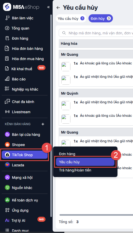 Bước 1: Tại màn hình tổng quan, chọn Tiktok Shop\Yêu cầu Hủy.
