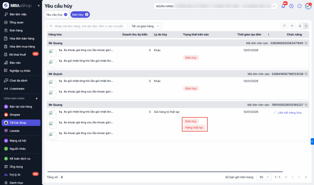 → Theo dõi, kiểm tra các đơn hủy do hàng bị thất lạc tại danh sách đơn hủy.