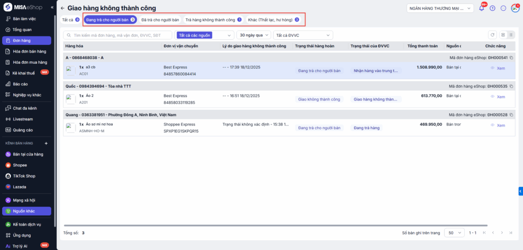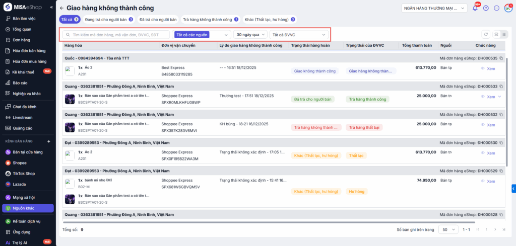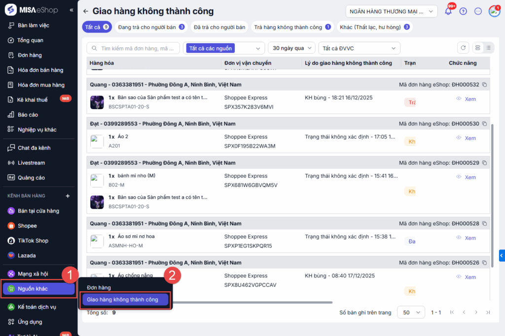 Bước 1: Tại màn hình trang quản lý, chọn Nguồn khác\Giao hàng không thành công