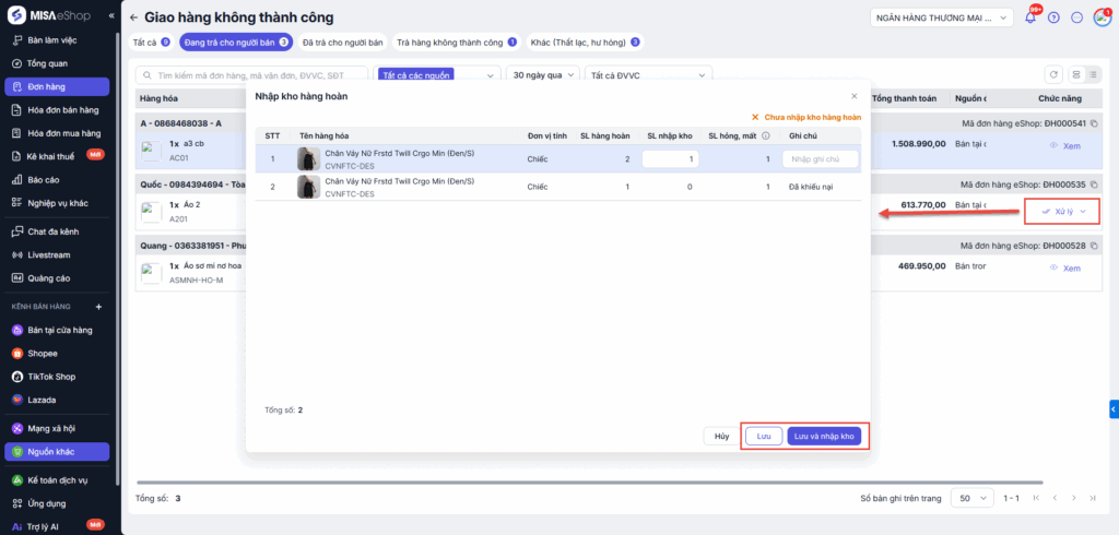 - Nhấn Xử lý → Kiểm tra lại thông tin hàng hóa → Nhấn Lưu hoặc Lưu và Nhập kho