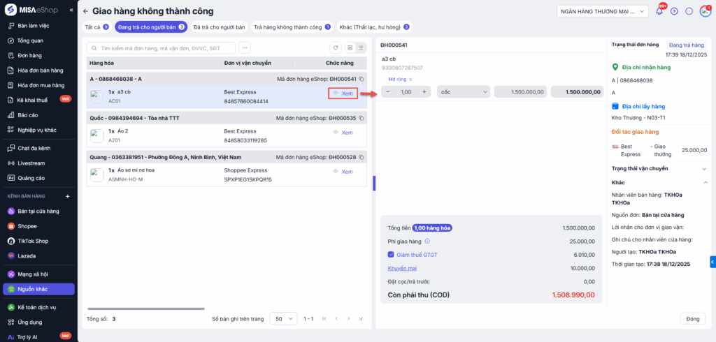Bước 2: Xem chi tiết trạng thái hàng hoàn
