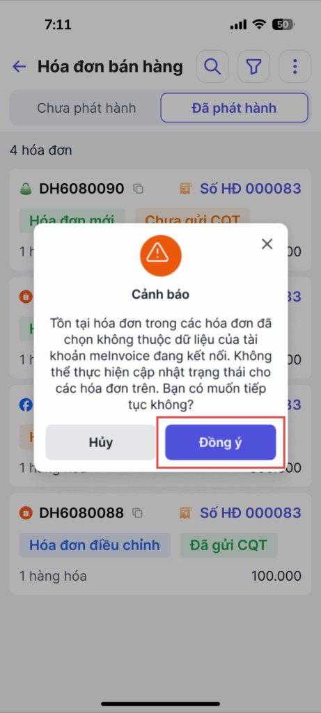 - Đã phát hành HĐ: Hóa đơn đã phát hành thành công.