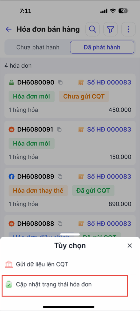 - Chọn Cập nhật trạng thái hóa đơn