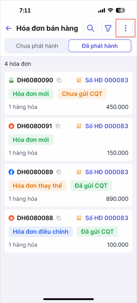 - Chưa phát hành: Là số lượng đơn hàng đã tạo nhưng chưa được phát hành hóa đơn điện tử.