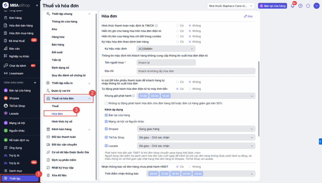 Bài viết hướng dẫn cách thiết lập hóa đơn trên phần mềm MISA eShop, bao gồm các tùy chọn liên quan đến hình thức thanh toán, hiển thị thông tin trên hóa đơn, ký hiệu hóa đơn theo kênh bán hàng và cấu hình tự động phát hành hóa đơn. Phạm vi áp dụng cho người dùng quản trị cửa hàng sử dụng dịch vụ hóa đơn điện tử.