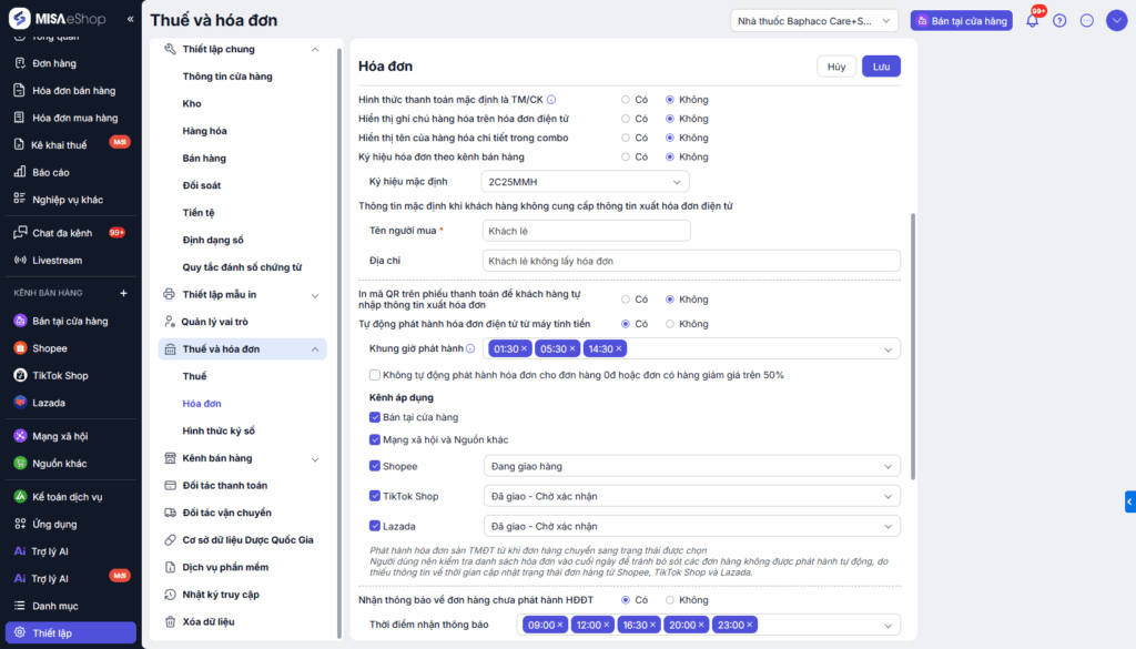 - Lưu ý: Không hiển thị thiết lập này với người dùng đang kết nối S-Invoice và MobiFone Invoice.