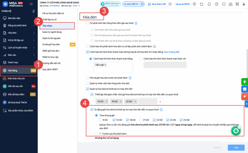 - Lưu ý: Nếu vượt quá thời gian đã chọn, hóa đơn có thể được phát hành vào ngày hôm sau. Khung giờ phát hành sớm nhất là 1h, muộn nhất là 23:30 trong ngày.