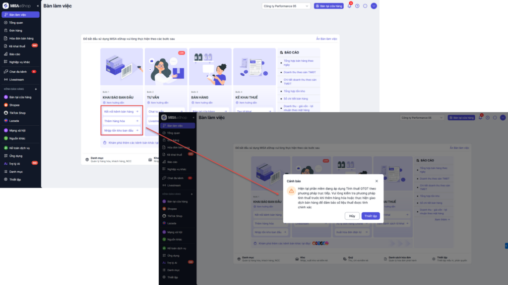 Phần mềm sẽ hiển thị cảnh báo kiểm tra thiết lập thuế, nhấn Thiết lập để tiến hành cài đặt.