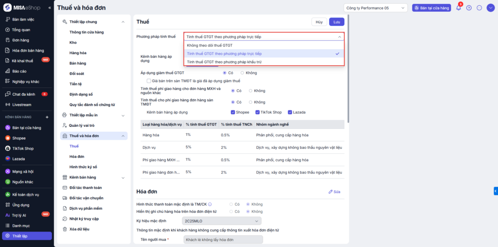 - Mặc định là “Tính thuế GTGT theo phương pháp trực tiếp”.