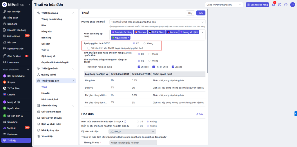 Thiết lập áp dụng giảm thuế GTGT:
