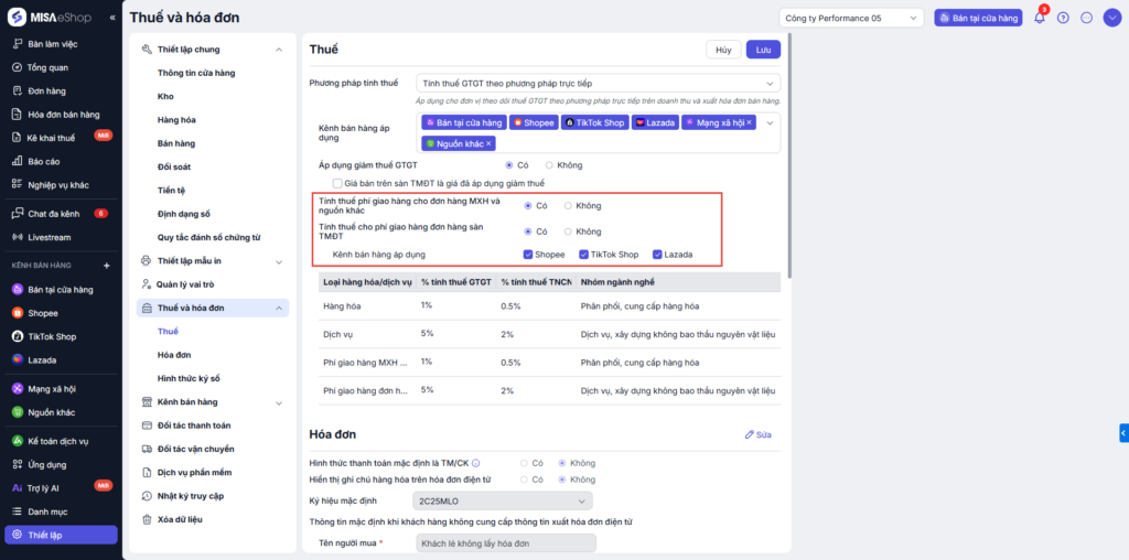 - Tích chọn “Có” nếu thực hiện tính và kê khai thuế GTGT cho phí giao hàng các đơn bán từ MXH (mạng xã hội) hoặc các nguồn khác ngoài sàn, cửa hàng.