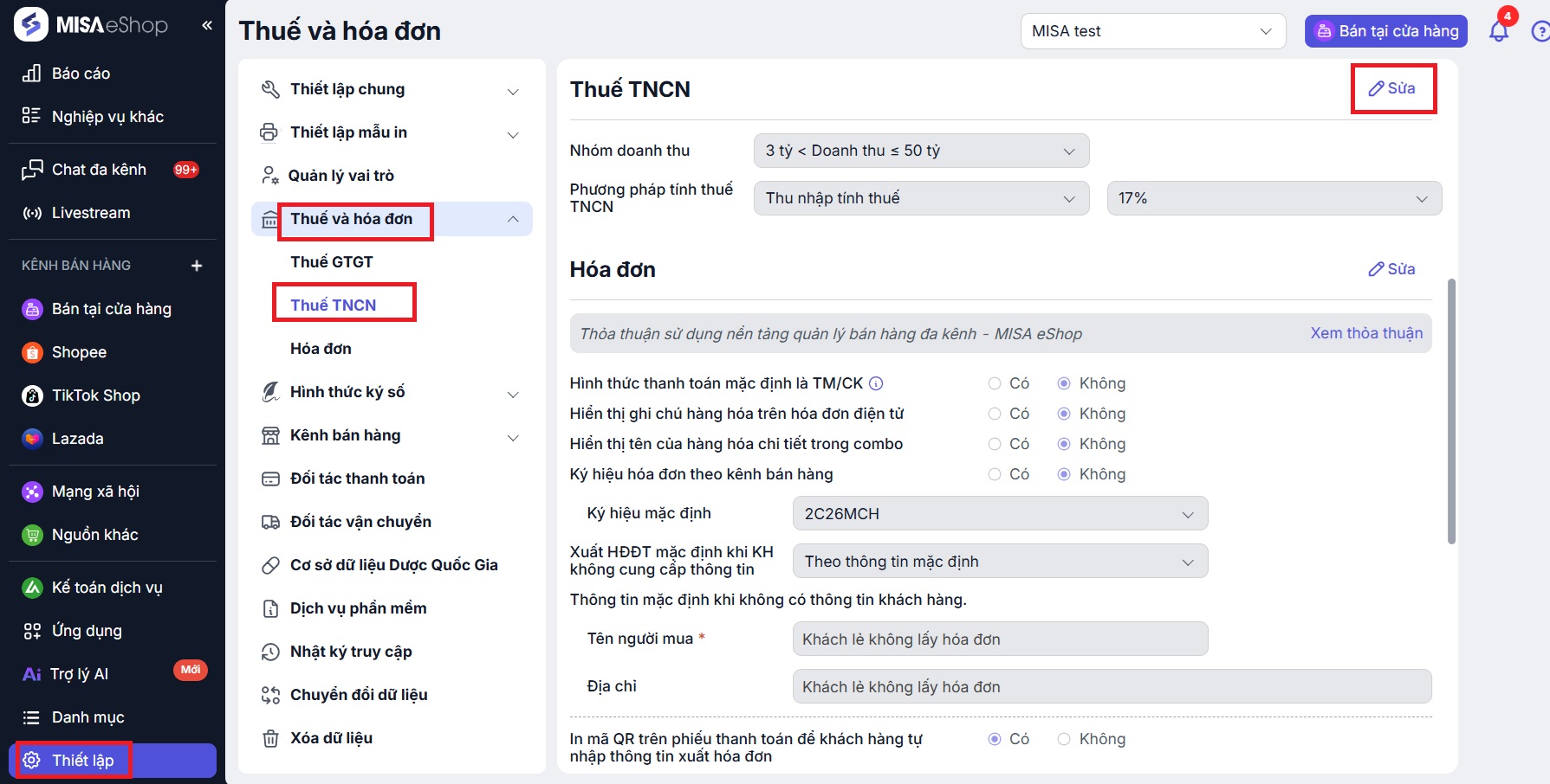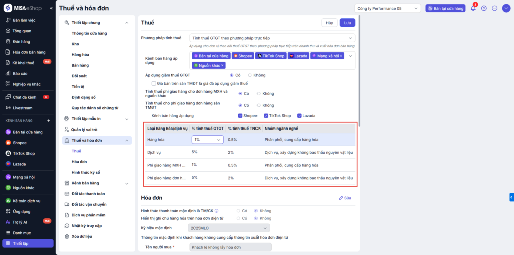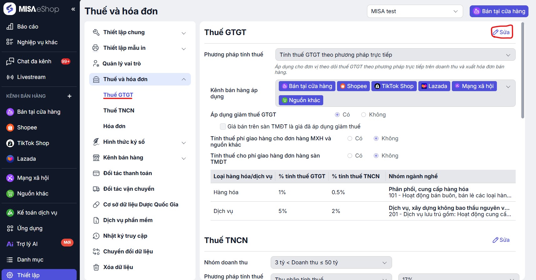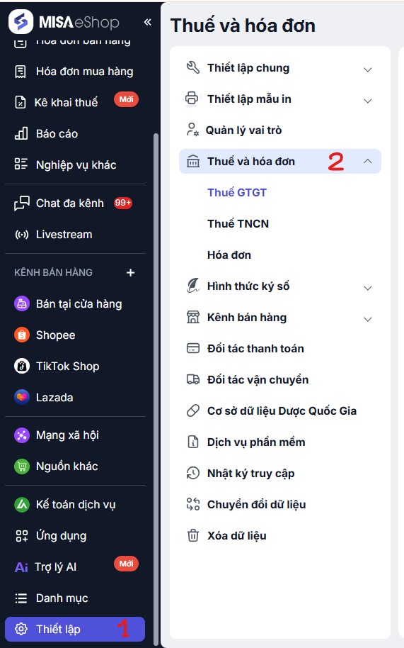 Truy cập vào Thiết lập > Thuế và hóa đơn > chọn Thuế GTGT hoặc Thuế TNCN.