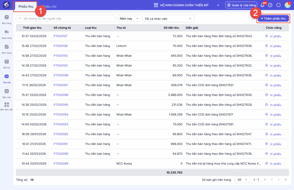 - Các phiếu Thu được hệ thống tự sinh khi bán hàng.