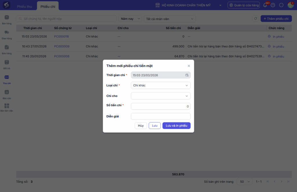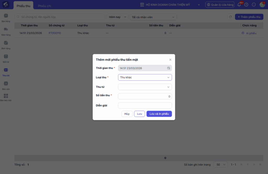 Ngoài các phiếu tự động phát sinh từ bán hàng, người dùng có thể chủ động tạo thêm phiếu Thu hoặc Chi tiền mặt khi phát sinh các nghiệp vụ ngoài hoạt động bán hàng, bao gồm: