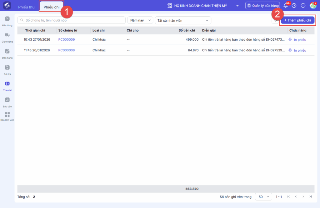 Tại màn hình Bán tại cửa hàng (POS), danh sách Thu – Chi hiển thị: