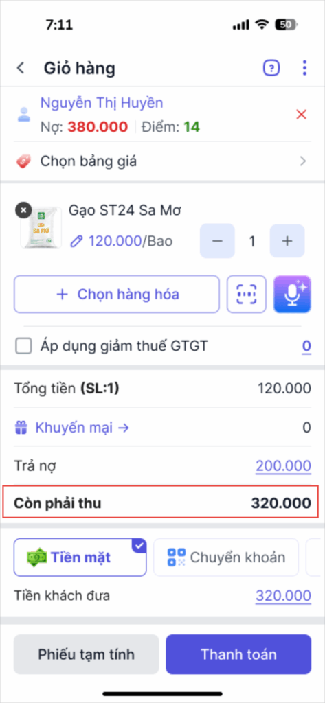 - Số tiền phải thu = Tổng tiền hàng hóa – Khuyến mại + Trả nợ