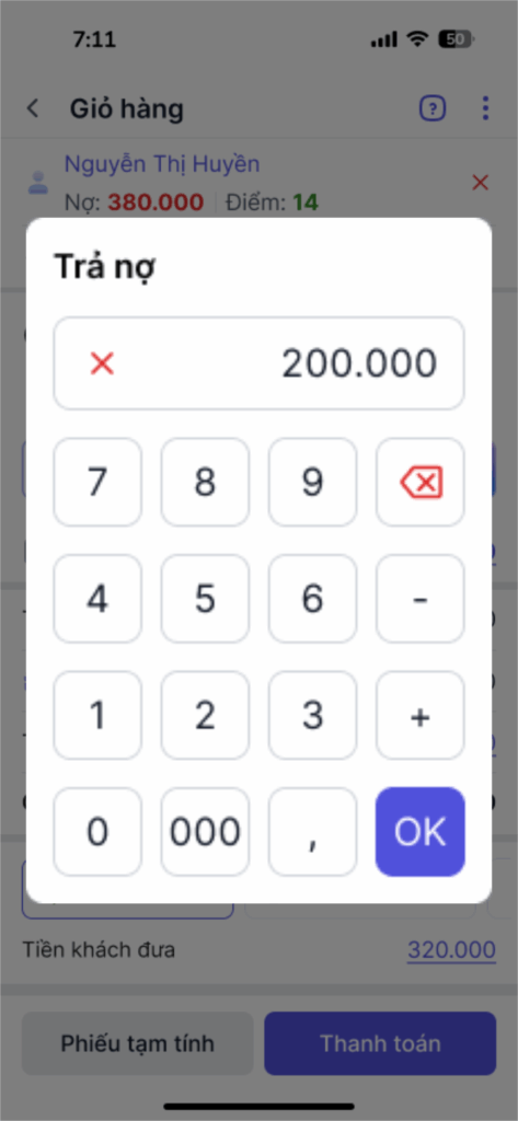 - Lưu ý: Số tiền nhập vào không được vượt quá tổng nợ hiện tại của khách hàng. Hệ thống sẽ hiển thị cảnh báo nếu nhập số tiền lớn hơn.