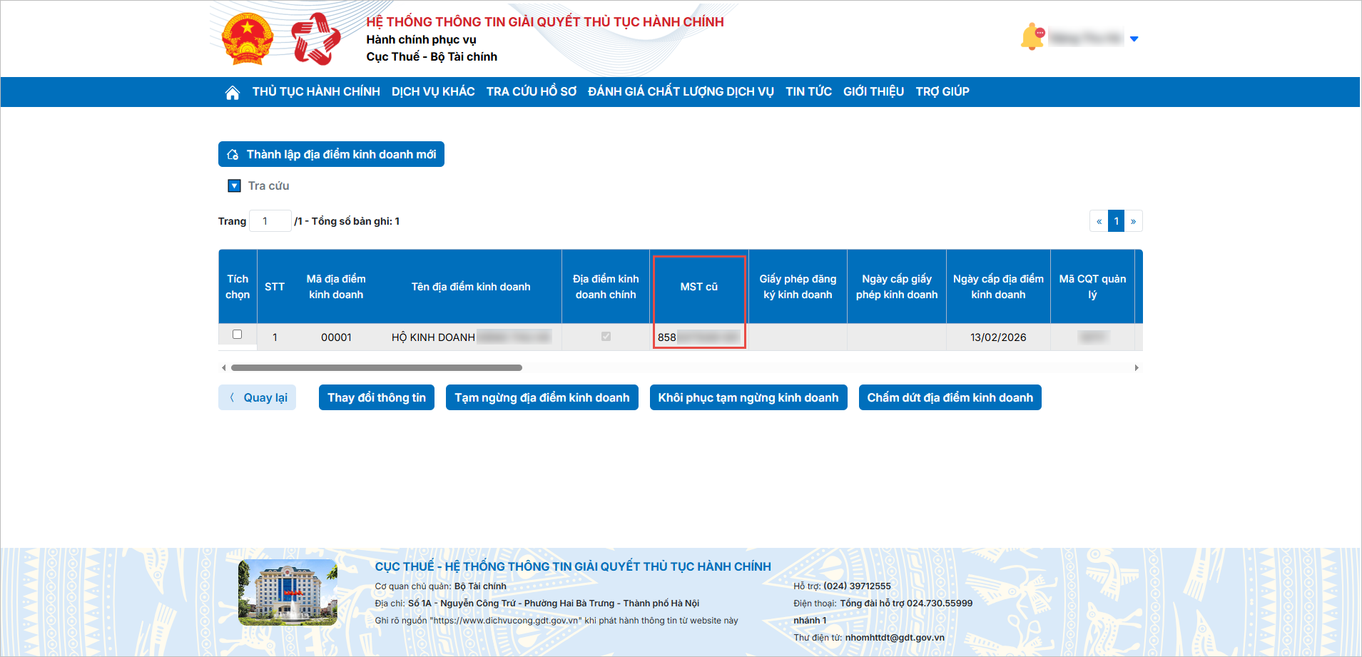 Bước 4: Tại đây, hệ thống sẽ hiển thị danh sách các địa điểm kinh doanh đã đăng ký. Anh/chị xem thông tin Mã số thuế cũ tại cột tương ứng để phục vụ cho việc kê khai.