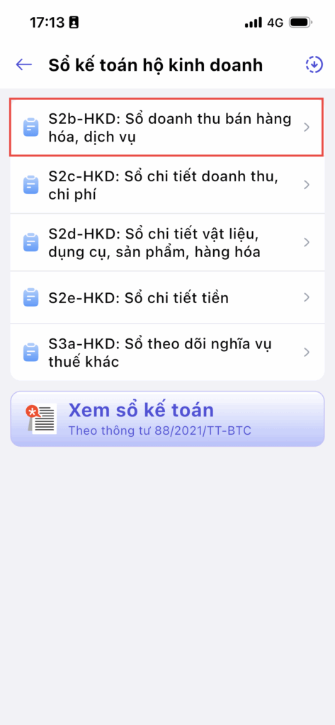 Bước 1: Tại màn hình trang tổng quan, chọn Sổ kế toán\S2b-HKD: Sổ doanh thu bán hàng hóa, dịch vụ