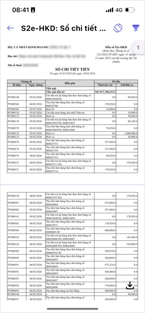 Sổ S2e-HKD áp dụng theo Thông tư 152/2025/TT-BTC, dành cho hộ kinh doanh có doanh thu: Trên 500 triệu đồng đến 3 tỷ đồng/năm, doanh thu trên 3 tỷ đồng đến 50 tỷ đồng/năm và doanh thu trên 50 tỷ đồng/năm. Nộp thuế GTGT theo tỷ lệ % trên doanh thu và thuế TNCN trên thu nhập chịu thuế.
