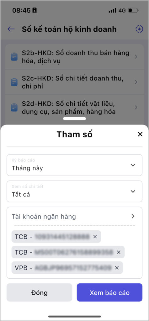 - Kỳ báo cáo: Chọn kỳ báo cáo theo tháng/quý/năm hoặc tùy chọn theo khoảng thời gian cần xem báo cáo.