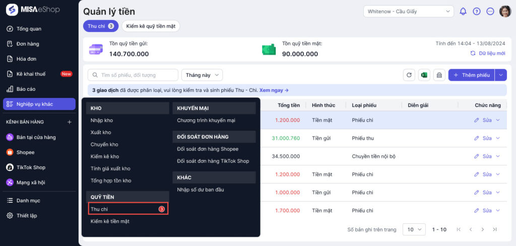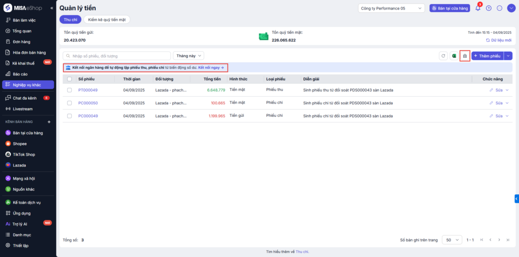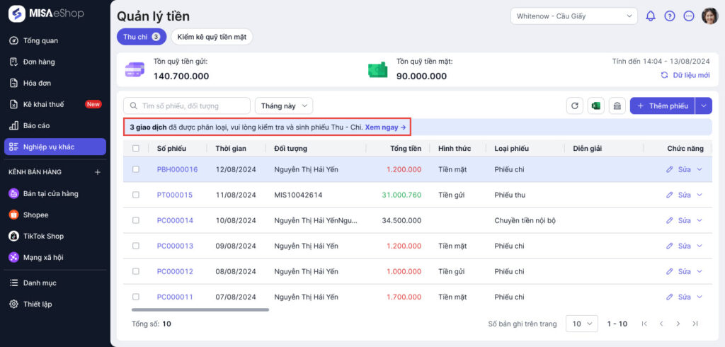 Hệ thống sẽ hiển thị tất cả các giao dịch không thuộc loại nhận tiền từ bán hàng (vì các giao dịch nhận tiền từ bán hàng đã tự sinh phiếu thu chi và được tự động gạch nợ trên đơn hàng).