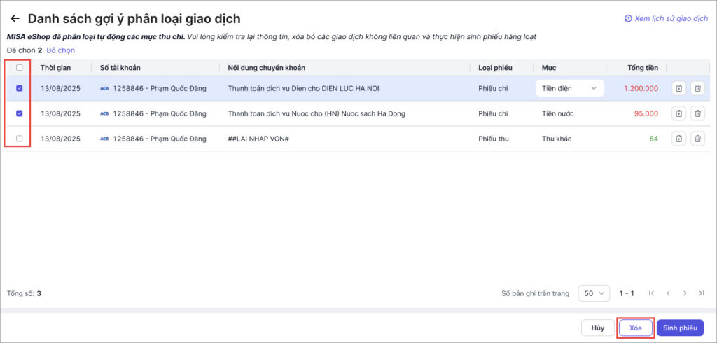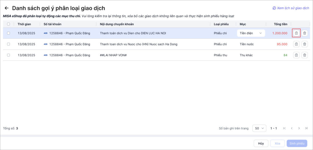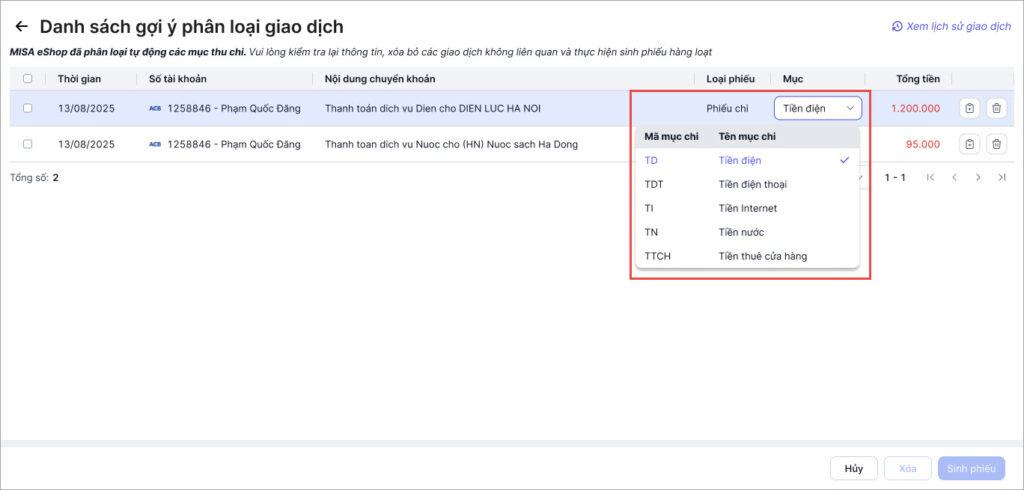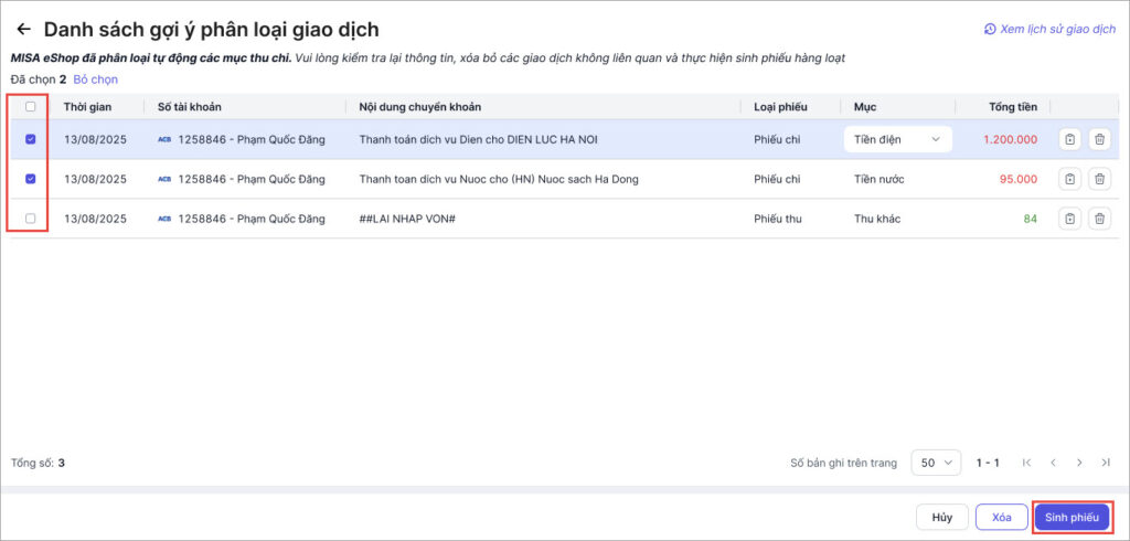 - Các giao dịch nhận tiền từ bán hàng sẽ được hệ thống tự động sinh phiếu thu/chi và tự động gạch nợ trên đơn hàng. Những giao dịch này không xuất hiện gợi ý sinh phiếu, người dùng không cần thao tác thủ công.