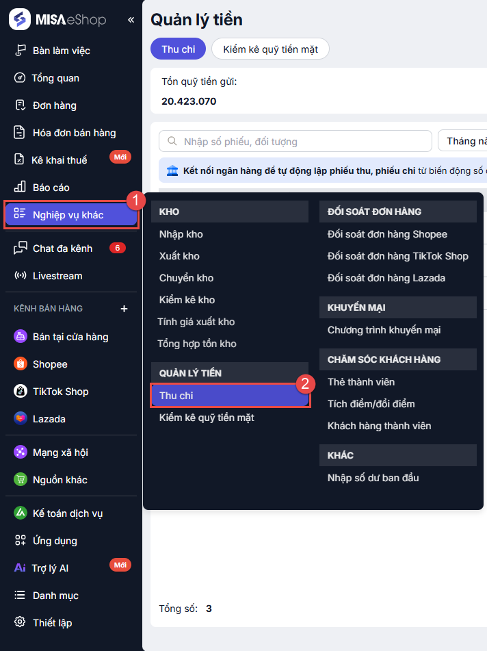 Bước 1: Chọn Nghiệp vụ khác -> Quản lý tiền -> Thu chi.