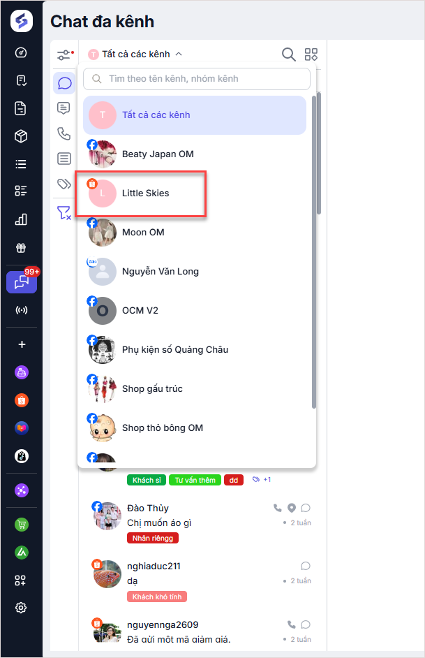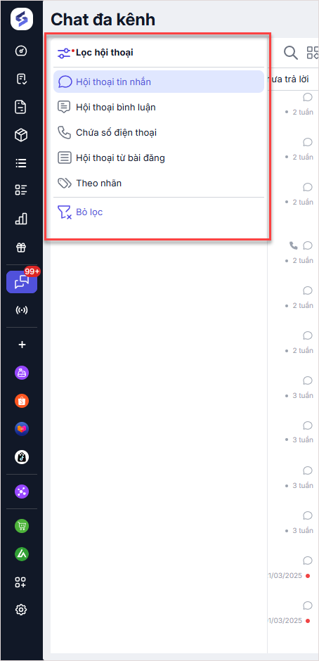 Tại giao diện Chat đa kênh, người dùng có thể sử dụng bộ lọc để nhanh chóng tìm ra các cuộc trò chuyện cần thiết theo nhiều tiêu chí: