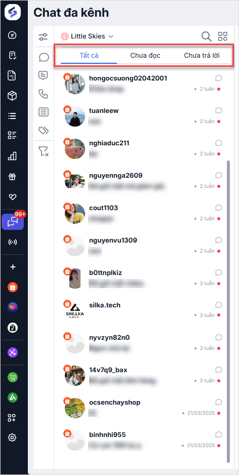 Chat đa kênh tổng hợp toàn bộ tin nhắn/bình luận của khách hàng theo các tab như sau: Tất cả, Chưa đọc và Chưa trả lời