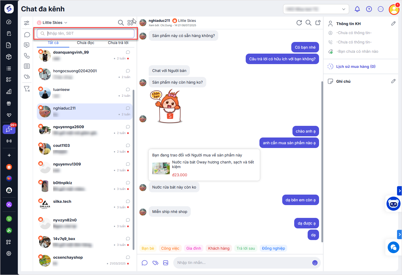 – Sử dụng thanh tìm kiếm để tra cứu thông tin khách hàng như: tên khách hàng, số điện thoại hoặc từ khóa liên quan trong cuộc hội thoại