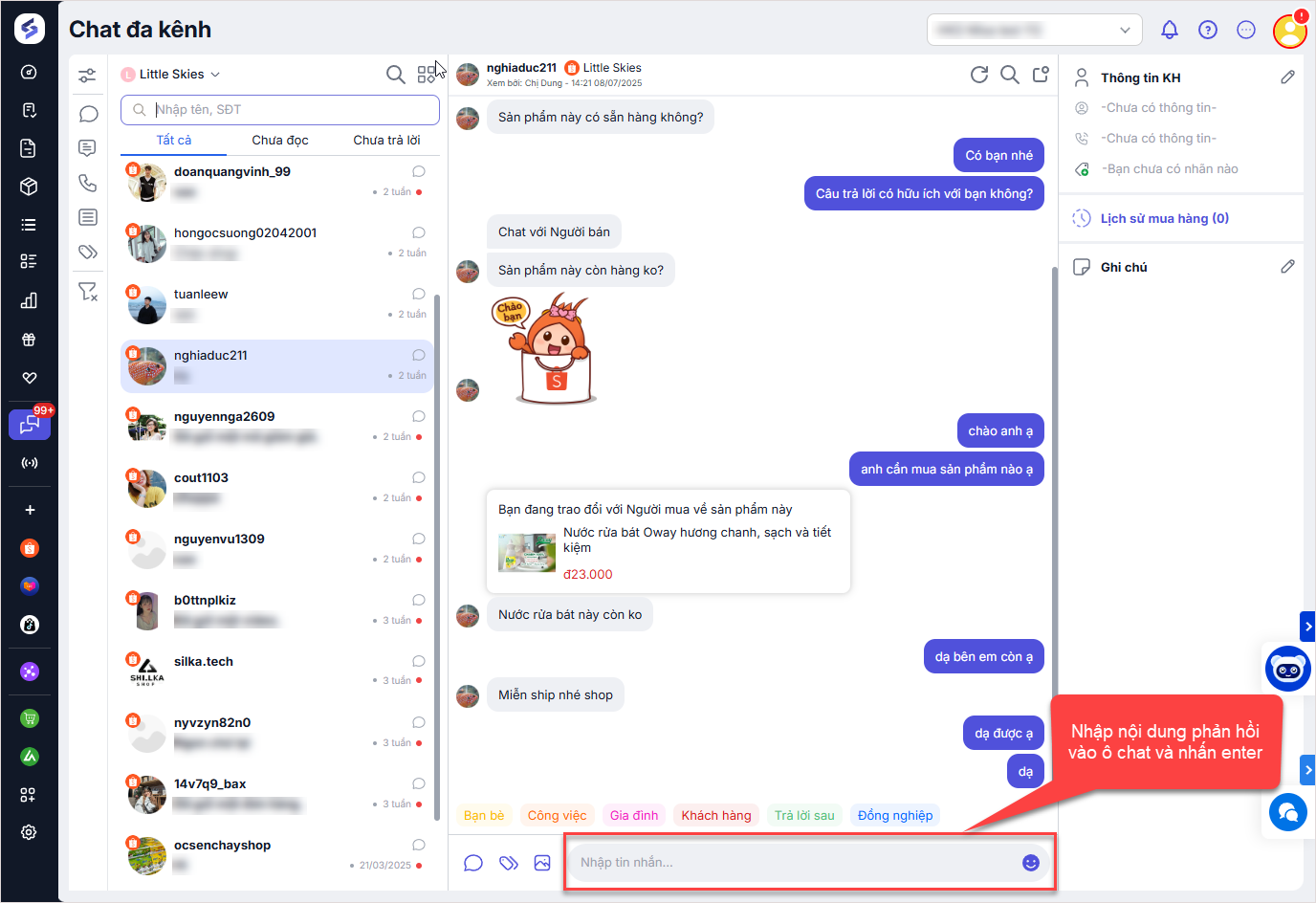 – Nhập nội dung phản hồi vào ô chat và nhấn enter để trả lời