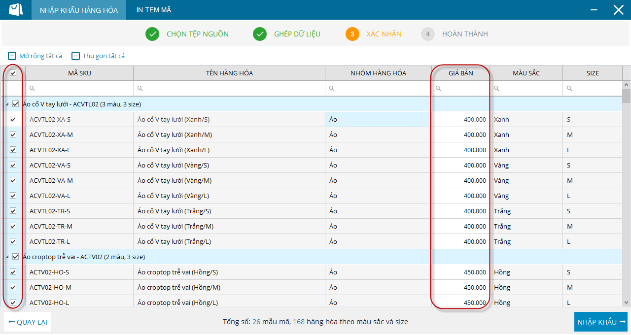 1. Tích chọn những hàng hóa muốn nhập khẩu vào phần mềm.
