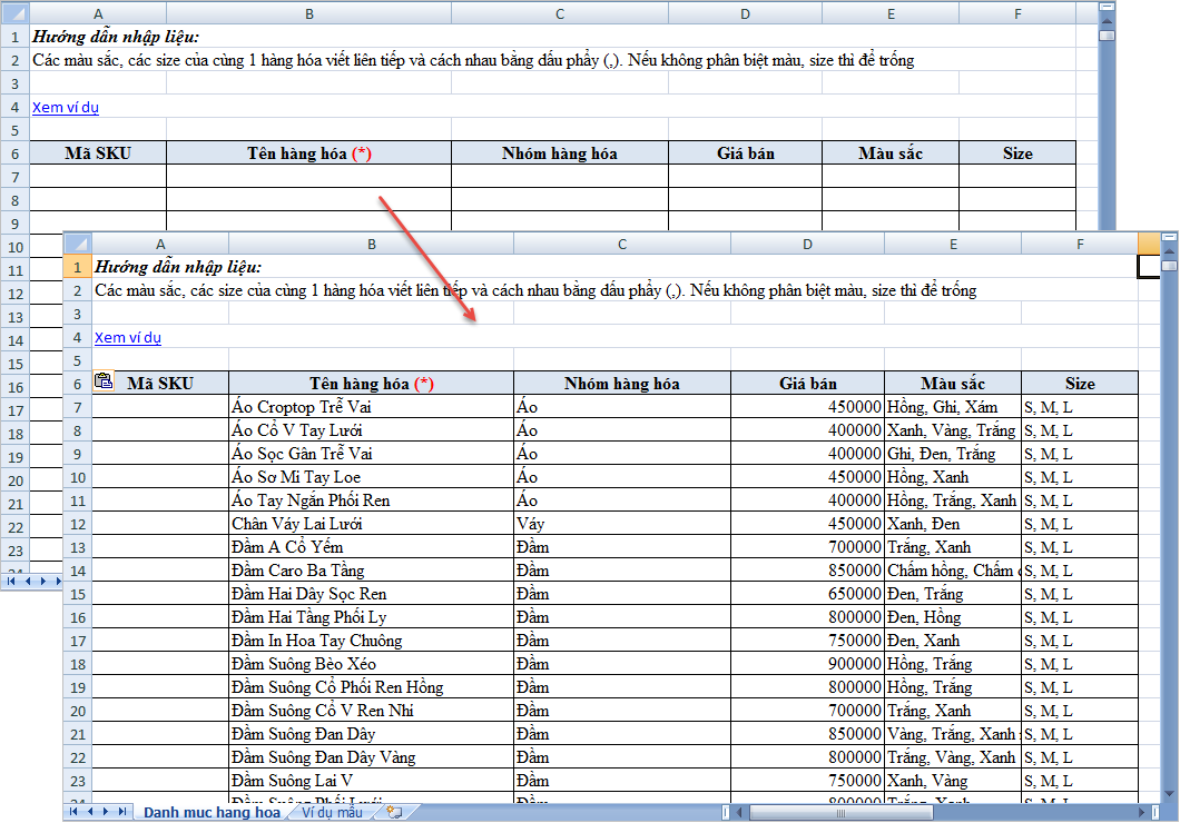 Kiểm tra danh sách hàng hóa có sẵn của cửa hàng. Lưu ý: Cột thông tin Màu sắc và Size (Kích thước) cần phân cách cách các thuộc tính bằng dấu phẩy.