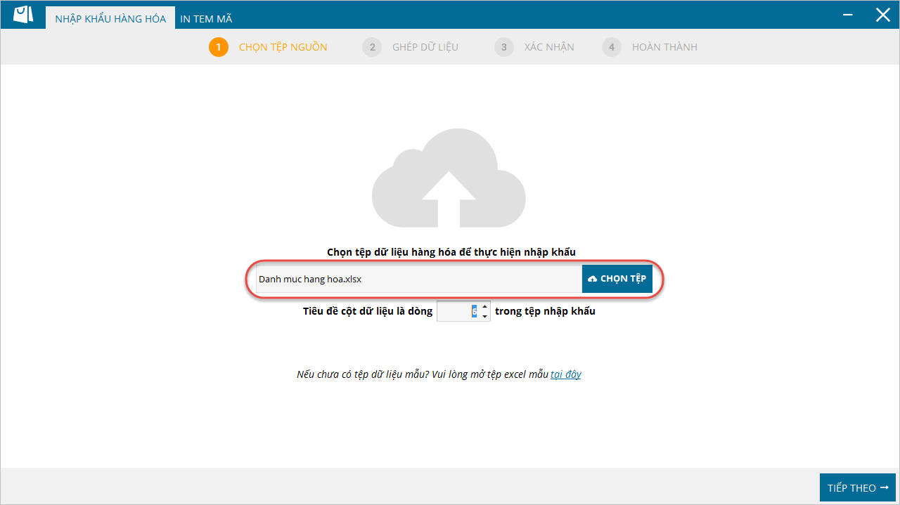 1. Nhấn Chọn tệp để tải lên tệp excel có sẵn của cửa hàng.