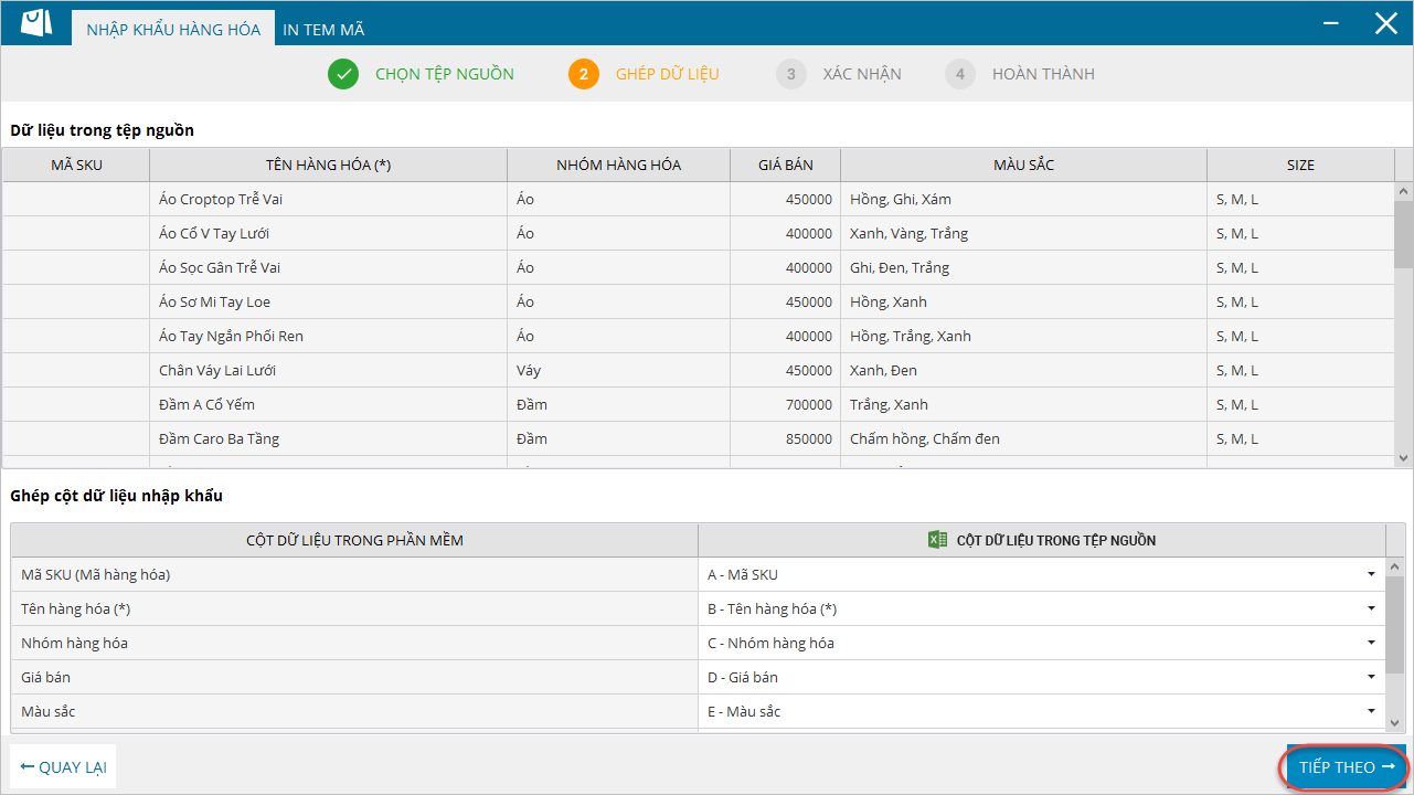 1. Phần mềm đã liệt kê thông tin các cột dữ liệu: Mã SKU (Mã hàng hóa), Tên hàng hóa, Giá bán, Màu sắc, Size. Anh/chị cần thực hiện chọn các cột dữ liệu tương ứng với các cột thông tin này trên phần mềm. Tại tab Cột dữ liệu trong tệp nguồn, nhấn biểu tượng mũi tên để chọn các cột dữ liệu trên tệp excel vừa tải tương ứng với các cột dữ liệu trên phần mềm.