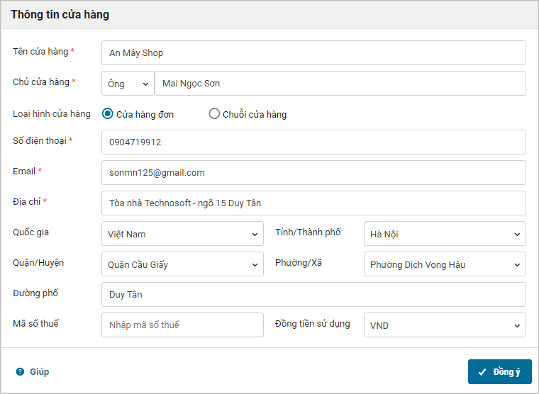 Tích chọn Cửa hàng đơn và thực hiện khai báo các thông tin còn thiếu.